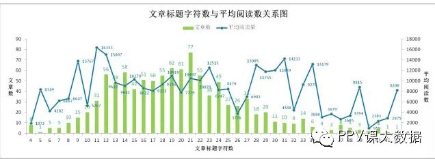 从样本文章标题的字符数统计来看,显然大家并未严格遵守“13字”法则,样本文章的标题字符集中于11个到27个之间。同样的,文章平均阅读量与标题字符数之间也并未呈现出明显的相关性。