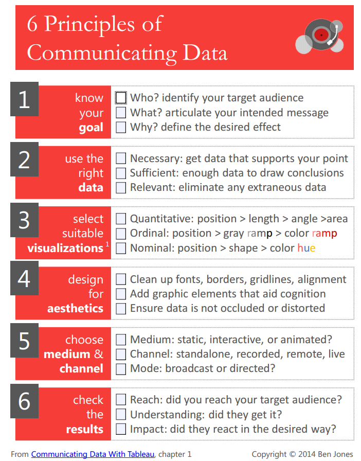 在数据通信与Tableau的第一章中(O'Reilly出版,2014年),本·琼斯勾画出通信数据的六大原则。现在,他把这六个原则纳入一个简单的清单,任何人都可以用它来提醒所有达到成功的沟通结果的重要成分。