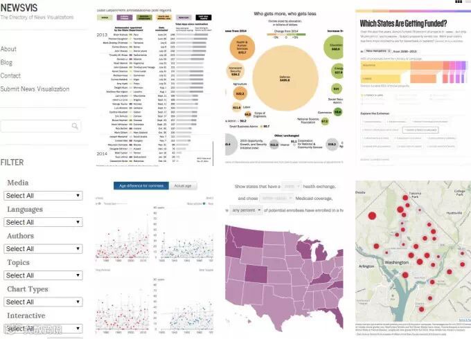 Newsvis是一个由Robert Kosara创办的网站,它的推出有三个主要目标:“一些报道表面已经完成但并不像纽约时报和华盛顿邮报那样是可视的;我们让他们可以搜索的图表而不仅仅是文字,并且为有灵感的人做可视化。”