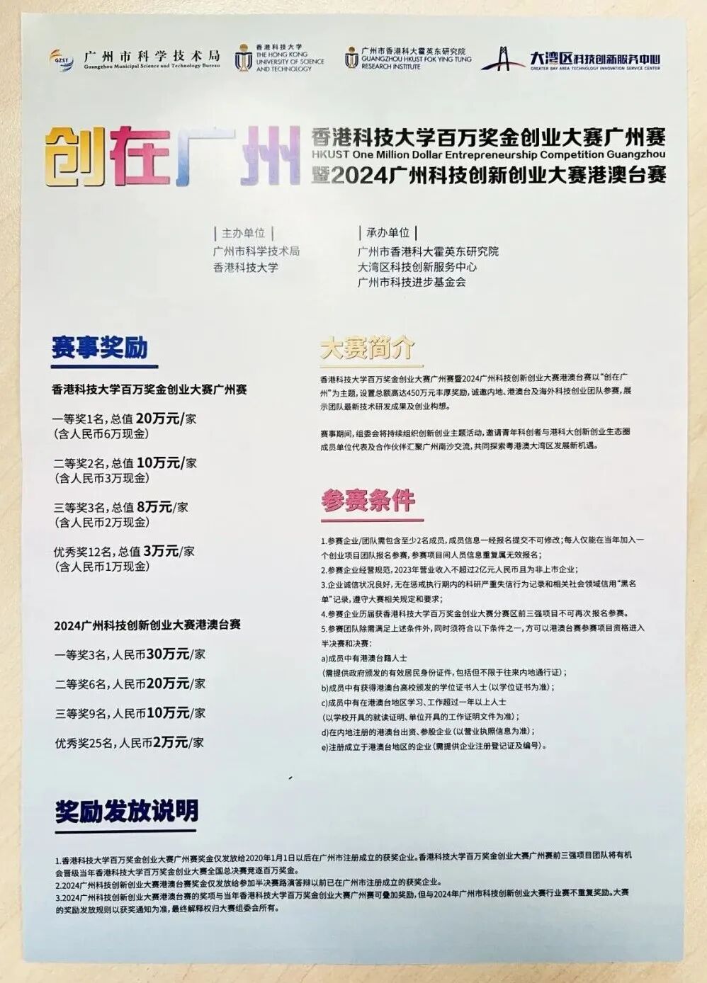 为激励参赛团队,大赛提供了丰厚的奖励、项目落地支持,香港科技大学百万奖金创业大赛广州赛和2024广州科技创新创业大赛港澳台赛分别设一、二、三等奖以及优秀奖,两赛奖项可叠加奖励,奖励总额高达450万元。前三强项目将自动入围香港科大百万奖金国际创业大赛的年度总决赛活动,并有机会争夺100万元现金冠军大奖。