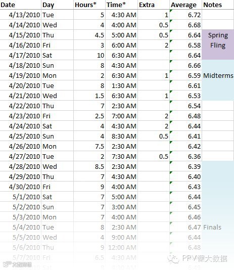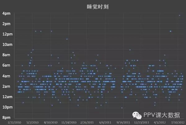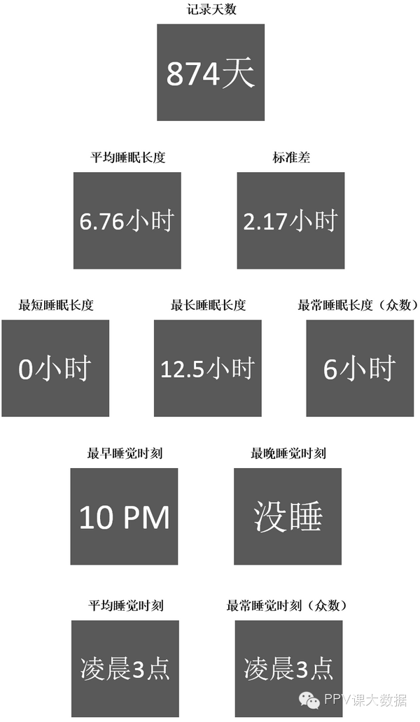 作为一个爱好统计数据的人,我从2010年开始记录我每天的睡眠时间,包括几点睡的觉、睡了多久,和之后补睡了多久。统计了两年半,从2010年2月12日到2012年8月6日,除中间部分时间回国没有统计以外,一共有874天的记录。