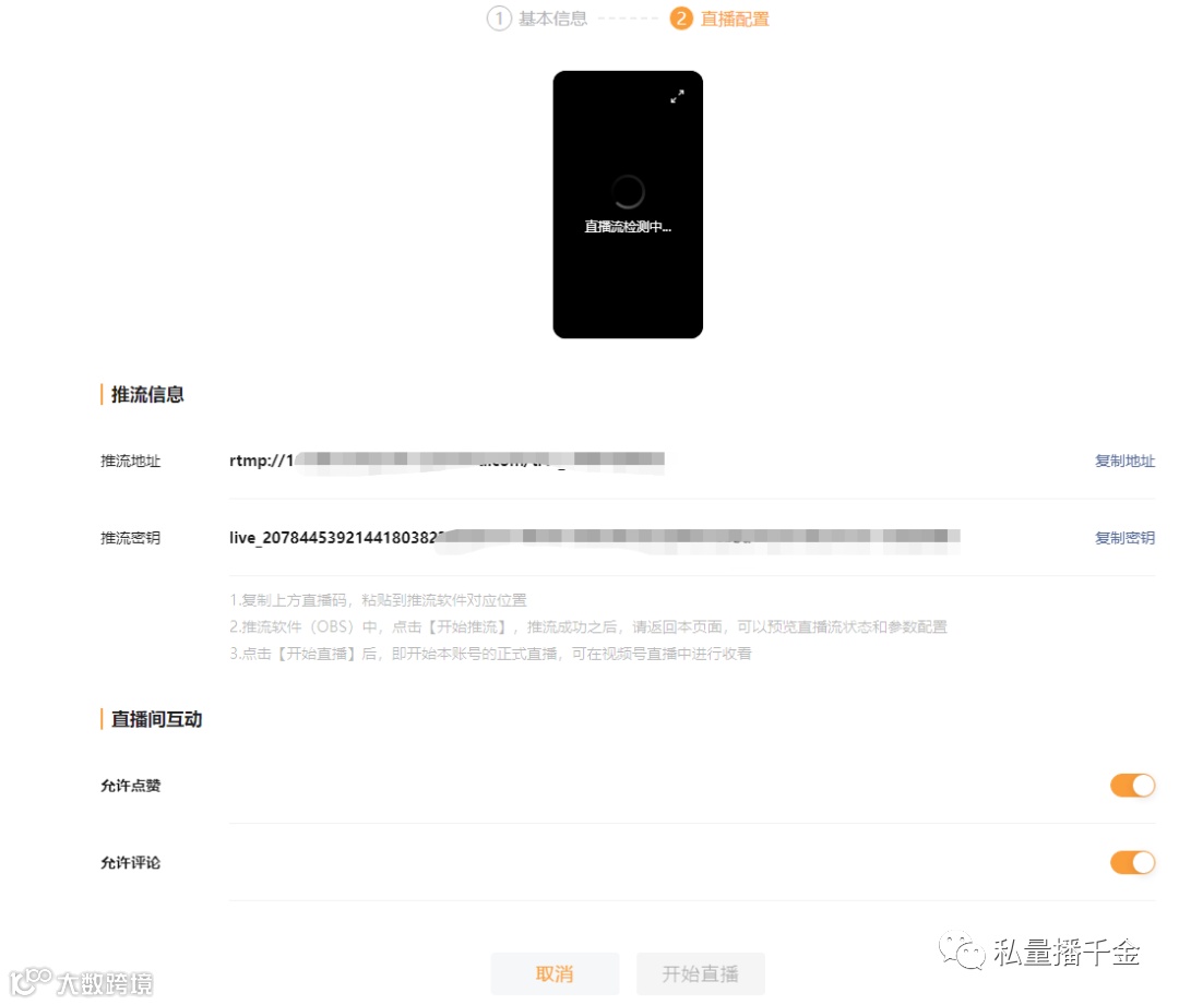 ④在直播配置界面,我们可以看到【推流地址】和【推流密钥】,每创建一次直播间,推流地址更换一次。