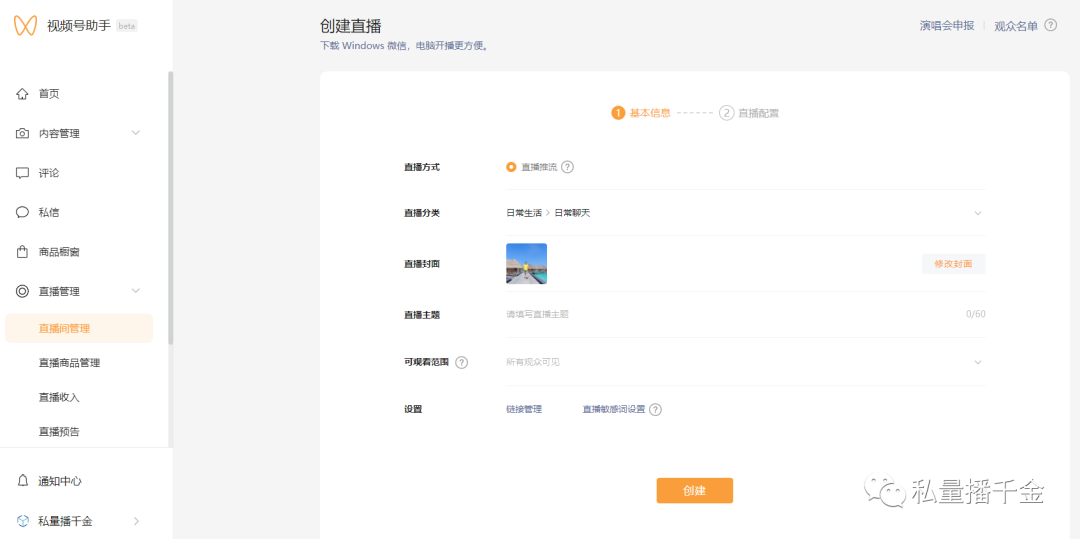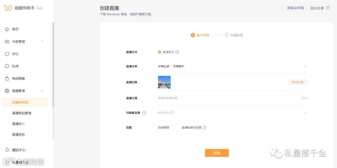 ②首页点击【直播管理】-【直播间管理】,完善基础信息,再点击【创建】,进入直播配置界面。