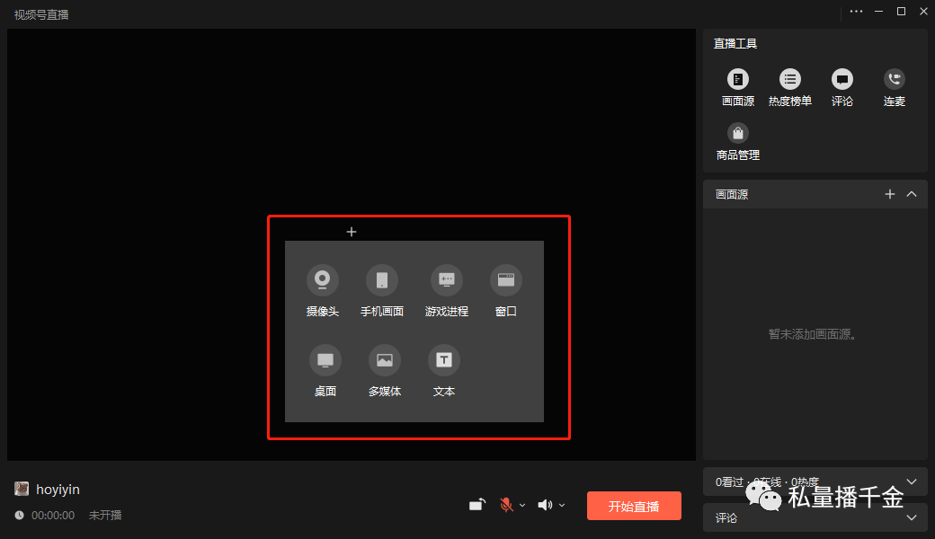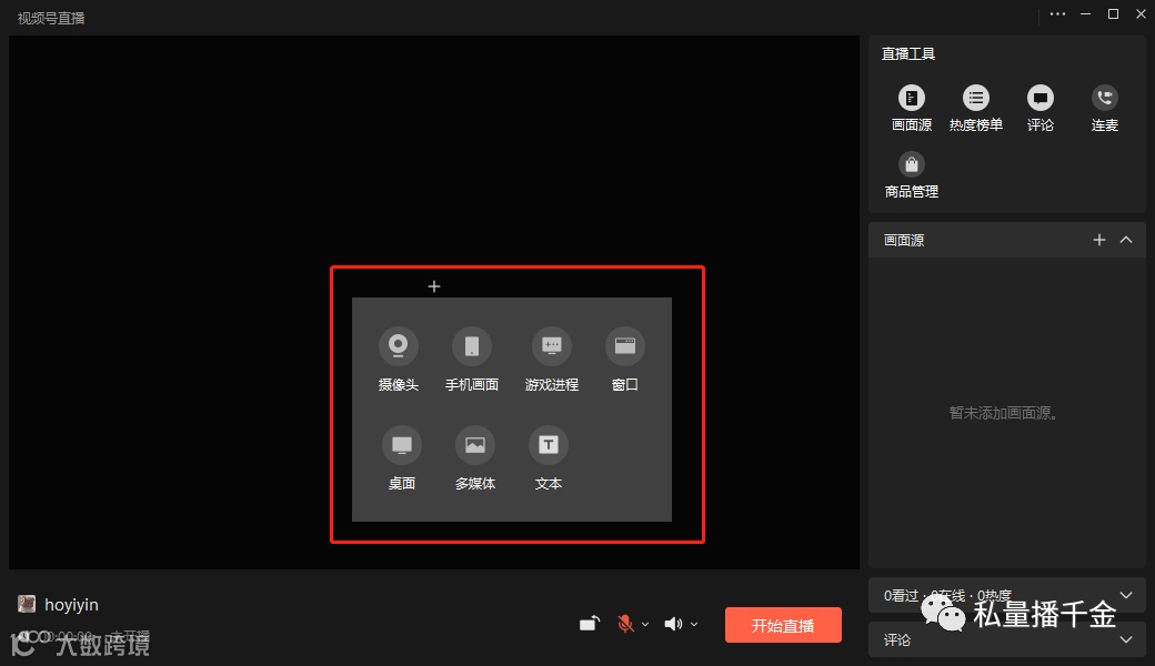 画面源分为摄像头、手机画面、游戏进程、窗口、桌面、多媒体、文本7种类型。