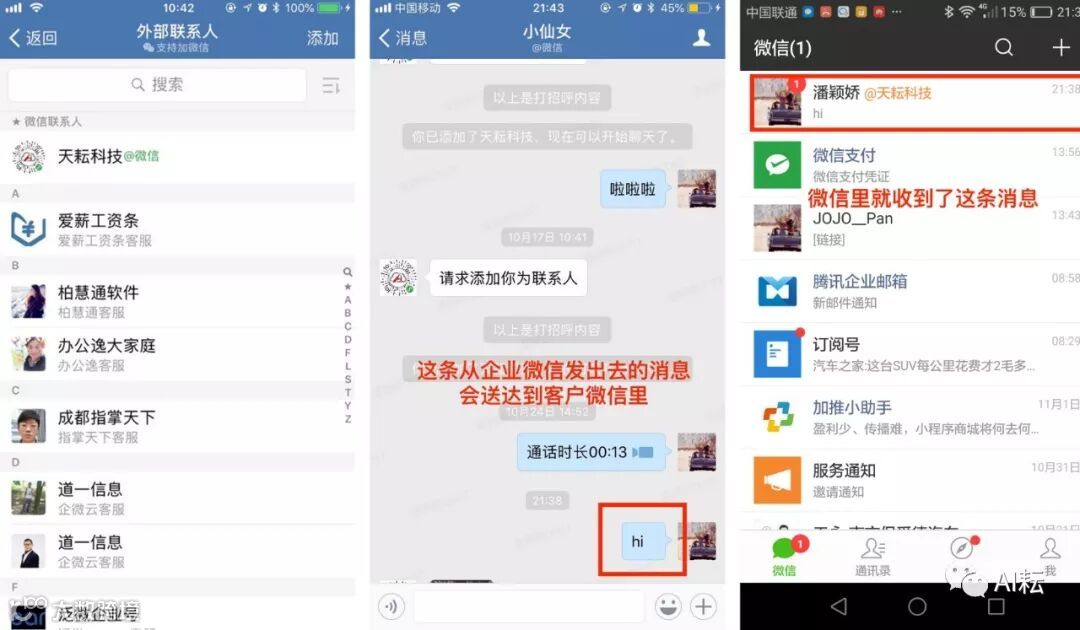 消息互通功能:员工使用企业微信和客户沟通,消息跨APP直接发送到客户微信里,不改变客户的沟通习惯没有违和感;