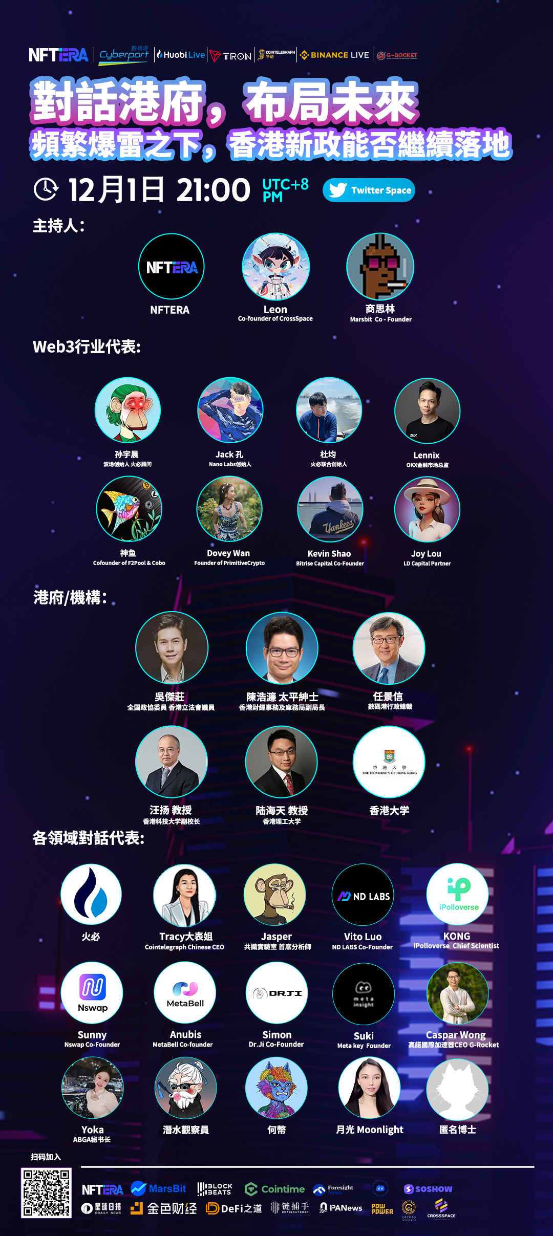 为了推动Web3.0企业落地香港,高诺国际加速器联同行业头部生态企业举行——“对话港府,布局未来”Space分享会,分享对于香港Web3.0行业发展和落地的看法,活动邀请到香港财库局副局长陈浩濂太平绅士、高诺国际加速器非执行主席及香港立法会议员吴杰庄博士、数码港行政总裁任景信先生等领袖在线上互动。行业大咖Nano Labs创始人Jack孔和孙宇晨等人亦积极投入活动,共同探讨相关议题,共商香港Web3.0发展大计!