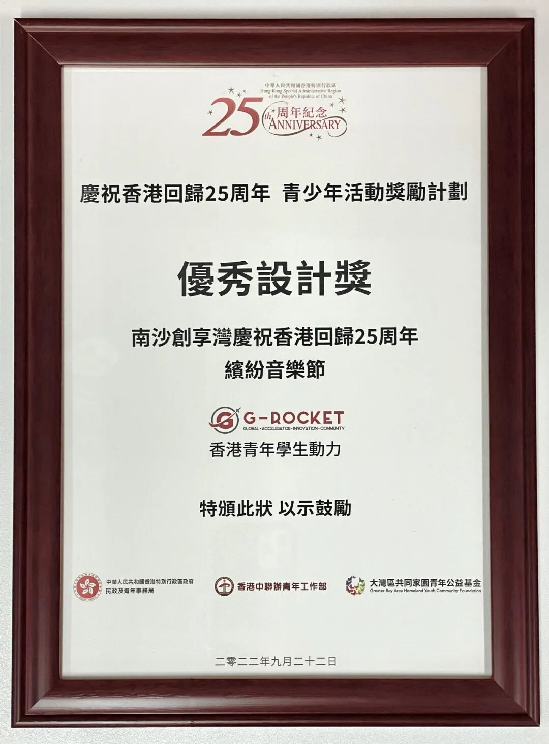 「南沙创享湾庆祝香港回归25周年缤纷音乐节」亦参与了由香港特区政府和中联办支持並由大湾区共同家园青年公益基金举办「庆祝香港回归祖国25周年青少年活动奖励计划」,荣获优秀设计奖殊荣,活动成果得到了高度肯定!