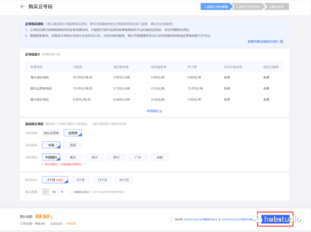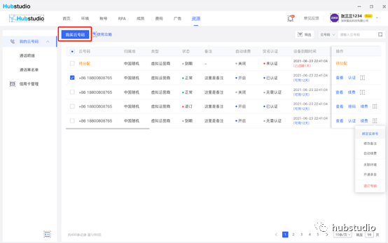 因为最近很多用户对云号码的需求越来越高,对此Hubstudio与号源方合作推出云号码服务,用户可以在Hubstudio中购买、管理云号码、以及查看云号码的短信和通过记录等等。用户也可以使用云号码接听电话或者接收短信。