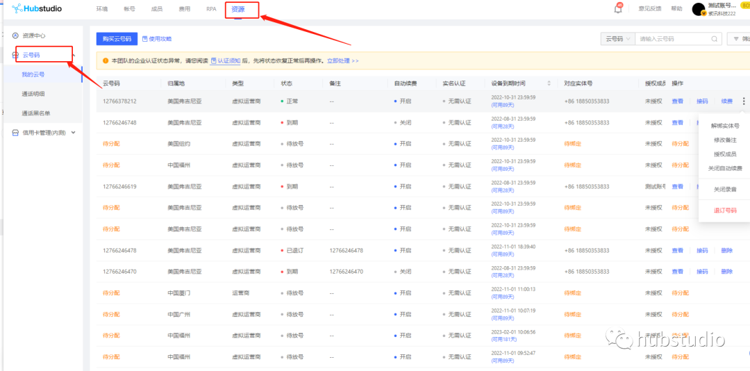 1.根据国家工信部规定,用户必须在hubstudio必须完成企业实名认证才能使用云号码功能。