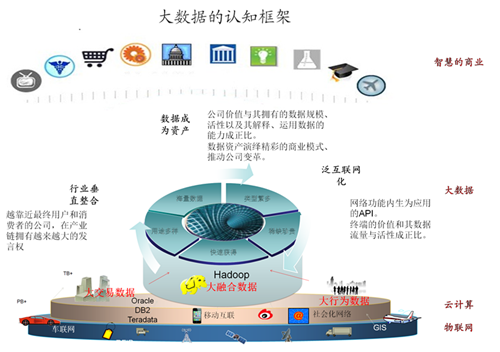 在2011年9月份,我们注意到业界在大数据领域的发展动向后,随即开始了系统的调研分析,先后走访了IBM、甲骨文、EMC、微软等行业巨擘,和国内A股上市公司、领风气之先的互联网公司、各大咨询机构、高校、研究所充分交流。连续发布了三篇大数据专题研究报告,持续跟踪海内外大数据领域的进展,逐步形成了相对完整的认知框架。此框架最早发布在券商报告《大数据时代三大发展趋势和投资方向》中,几经修改,如图1-13所示。