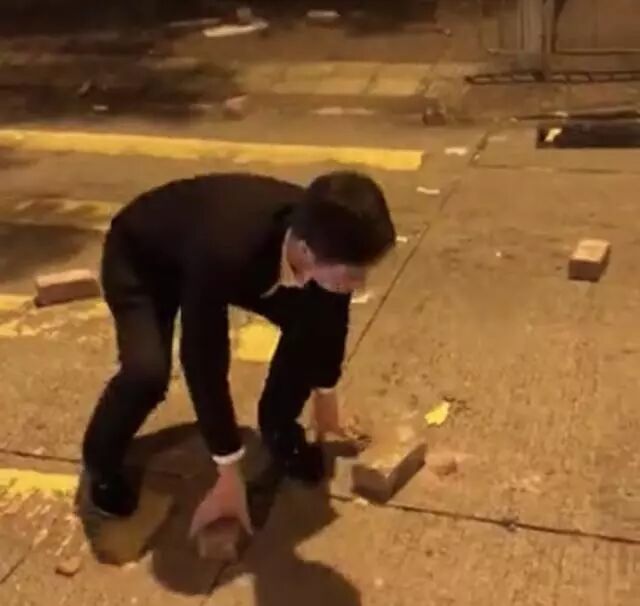 据北京日报报道,11月11日,在香港九龙塘附近的一条主干道被暴徒设置的路障堵塞,地上散满砖头,车辆难以通行。而在当晚11时左右,一名身穿西服的男子挺身而出,独自徒手清理砖块。此举被网友们纷纷点赞!