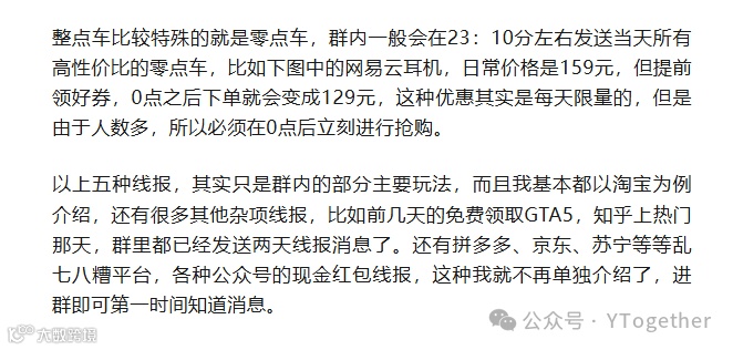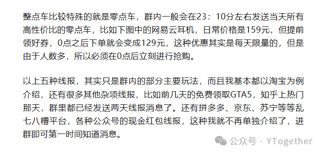 整点车,顾名思义,就是每天整点以后生效的特价商品,一般是5折。整点前群内一般会发线报消息,提示先领券,到点直接下手。