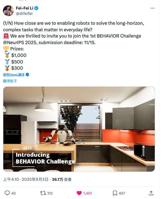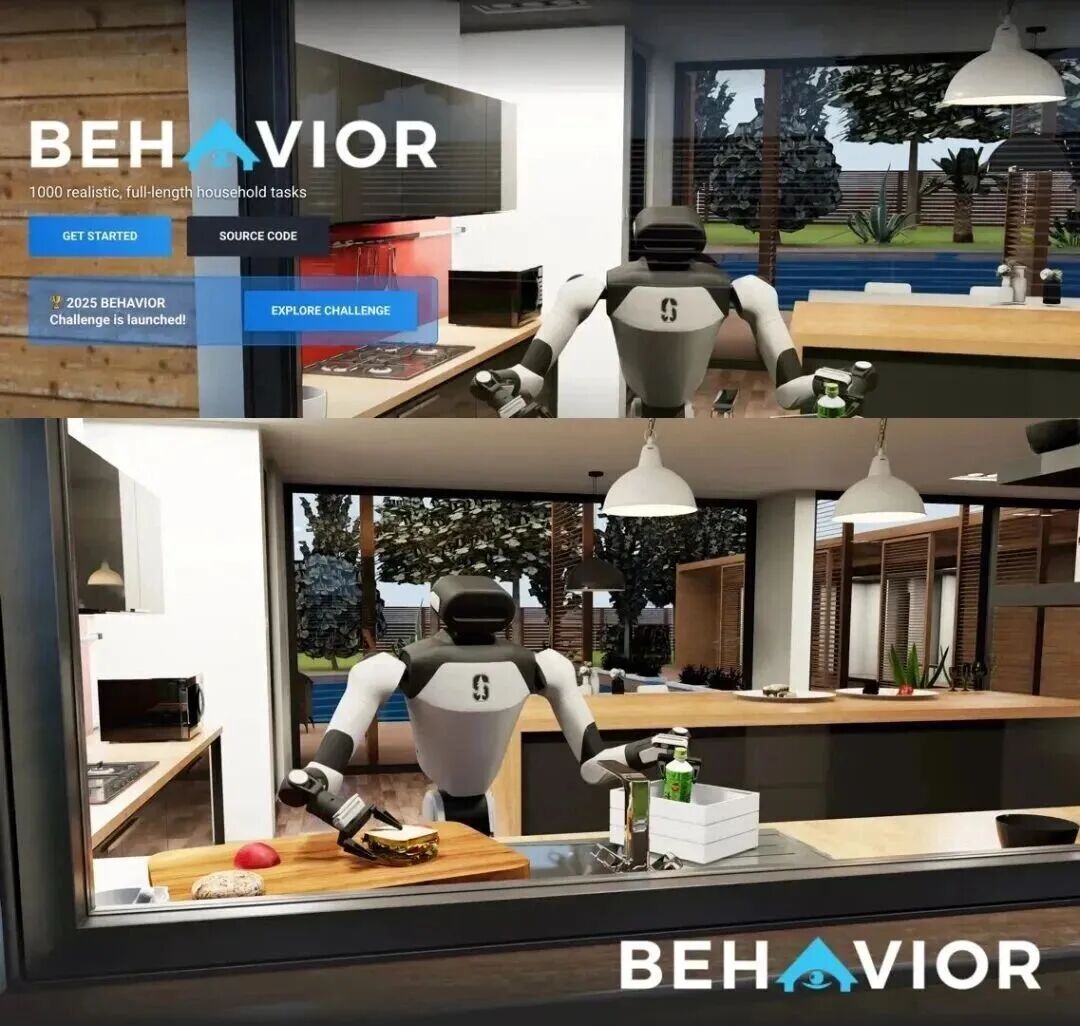 在学术前沿,李飞飞团队的发起首届 BEHAVIOR 挑战赛,超越了传统的物体识别任务,构建了一个包含上千种日常用品、需要执行近百种逻辑任务的虚拟家庭环境。其伟大之处在于,它要求AI不再仅仅是“识别一个杯子”,而是要“拿起杯子,走到水池,拧开水龙头冲洗”。这推动了AI从被动感知向主动规划与决策的跨越,是通往通用具身智能的基础性探索。