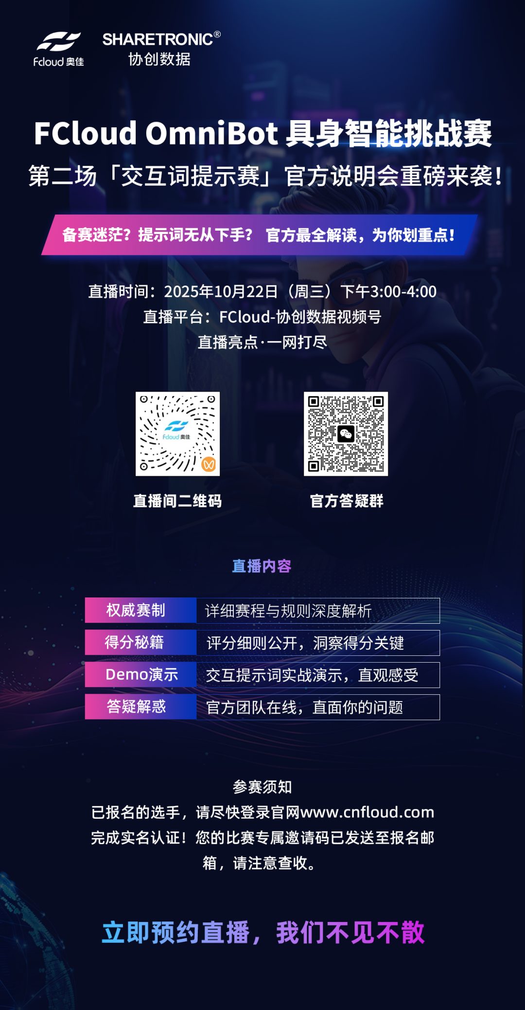 为助力参赛团队备战,我们将于2025年10月22日(周三)下午3:00-4:00在FCloud-协创数据视频号举办专题直播培训。
