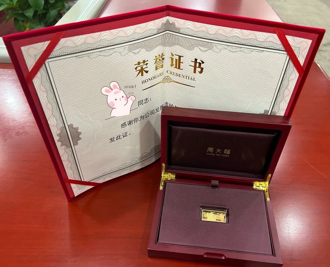 首先进行的是激动人心的 “十年员工” 颁奖。公司每年都会给当年度满十年的员工做出特别奖励,本年度共有13位十年员工,他们每人都获得了一根“寰创十年”定制纪念金条。