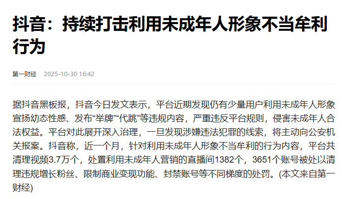 打击利用未成年人牟利:专项整治幼态擦边、举牌代跳、童星噱头等,开展专项治理。