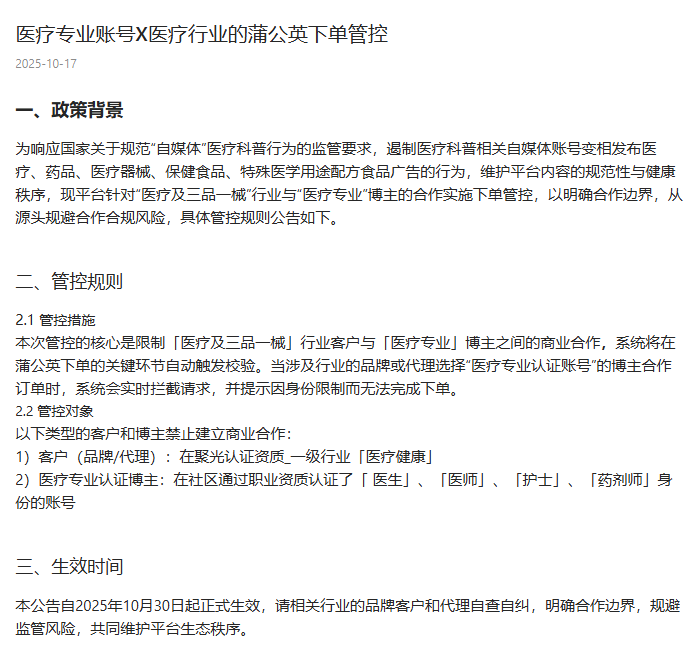 自10月30日起,全面禁止“医疗及三品一械”(药品、保健食品、特殊医学用途配方食品、医疗器械)行业与平台认证的医疗专业博主进行商业合作,资质认证门槛更严。