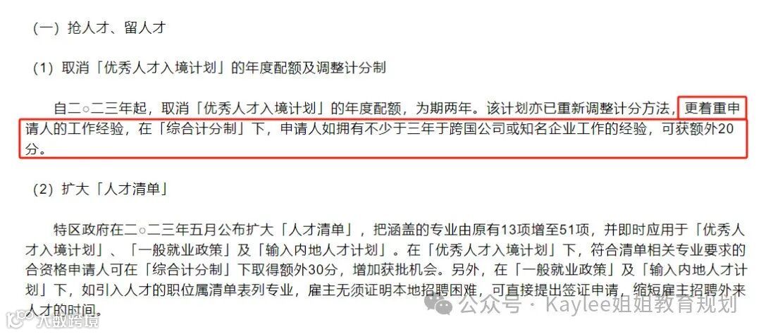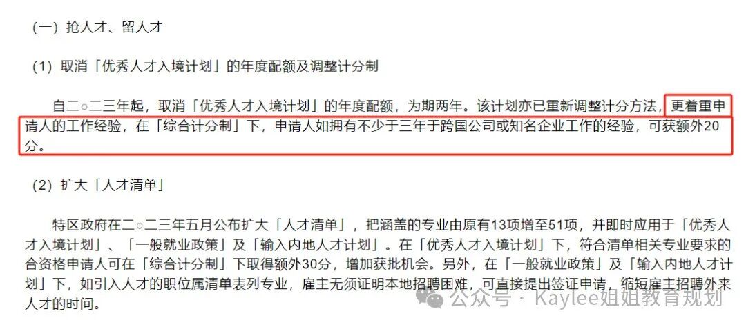 目前,优才新政增加了“不少于三年于跨国公司或知名企业工作经验,可获20分的加分。”其中不难看出,香港优才的着重点在高学历,有全面视野的精英人才上。
