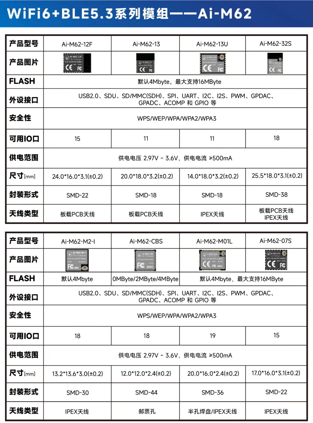 安信可推出的Ai- M61 和 M62 系列模组,基于 BL618 和 BL616 芯片,支持 Wi-Fi 6 (802.11ax) + BLE 5.3 + Thread 协议,高带宽、低延迟、低功耗。
