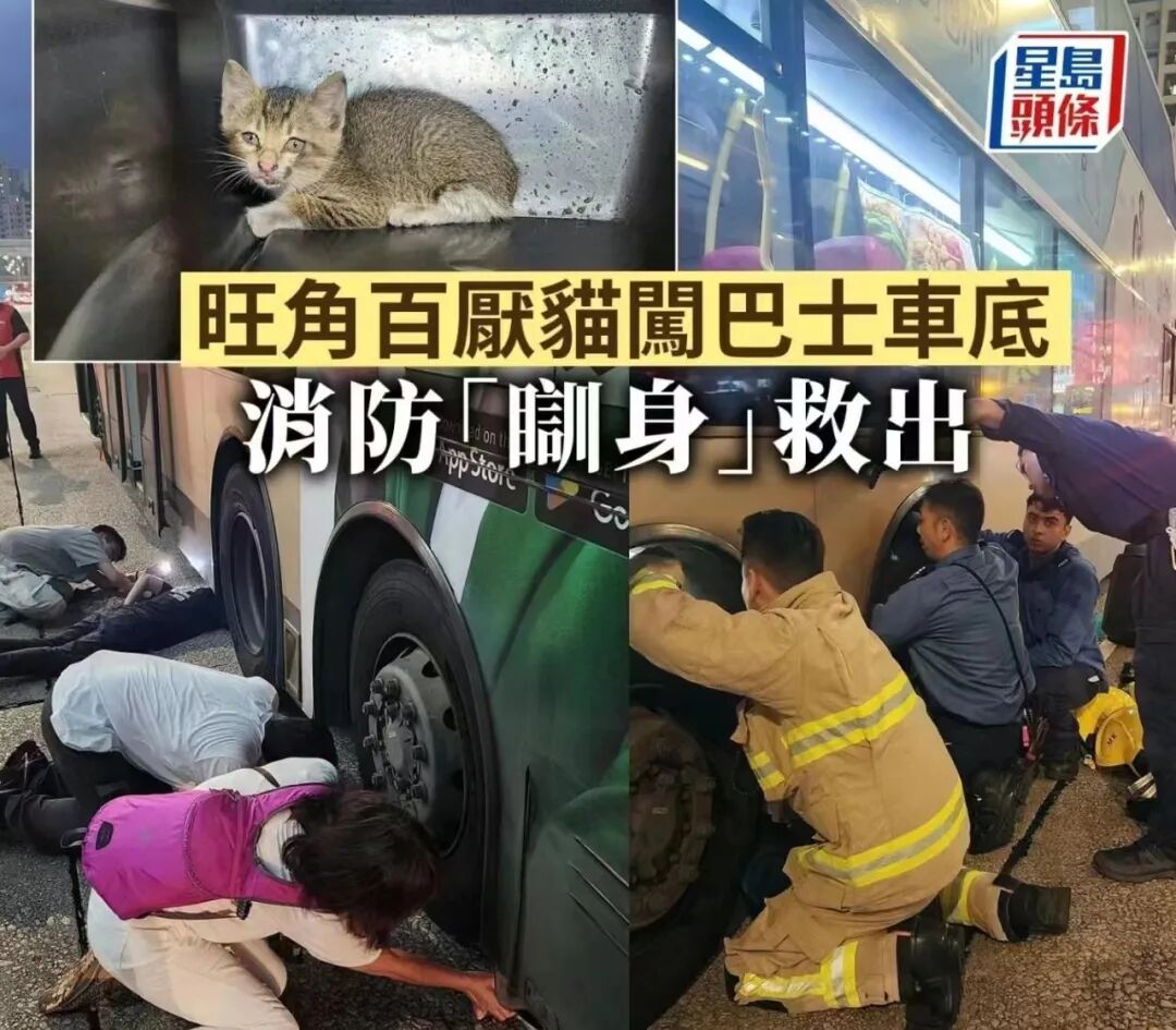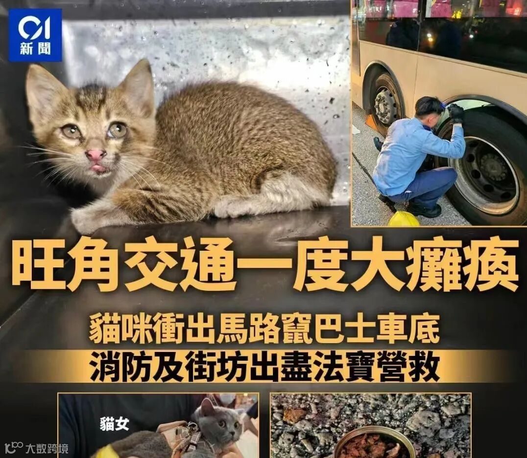 还有一则是最近一只流浪猫猫在旺角的弥敦道附近被困在巴士的轮胎旁了,市民们齐齐出动,和消防员一起营救。最终小猫猫被救出,据说还有爱心人士担心猫猫的去向,主动跳出来说是他家猫猫被困,最后流浪猫猫被爱心协会带走。