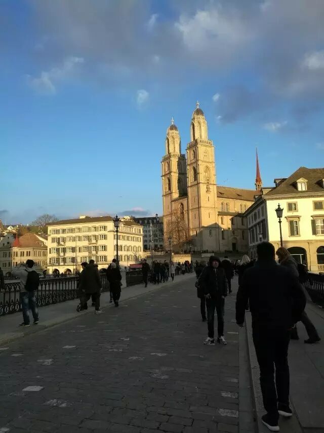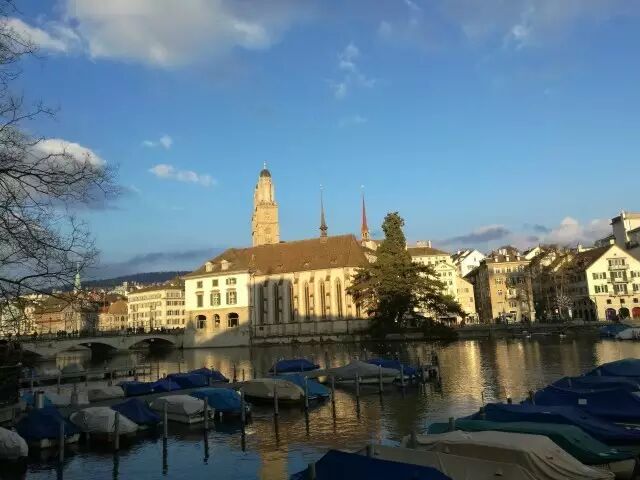 瑞士苏黎世,苏黎世市内有中世纪时期的教学尖塔、古堡、喷泉;利马特河两岸有双塔式罗马大教堂、修女院、市政府和许多现代化的住宅、旅馆和饭店等。苏黎士湖犹如一弯新月倚在市区的东南端,长达40多千米,蔚蓝色的天空映着碧绿的湖水,片片白帆摇曳着湖上的云彩;郊区的山谷绿草如茵,林木葱茏。