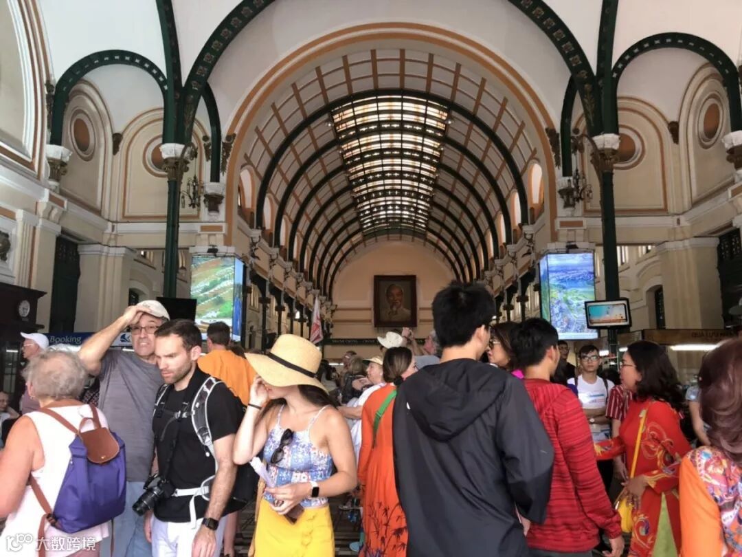 ▲这座邮政局有着老车站的外表,走进一瞧才发现并不简单。大厅装饰华丽十分考究,墙上最醒目的位置放置着胡志明的肖像。总体上弥漫着浓浓的法式风情,据说几乎每个游客都会来这里寄明信片。