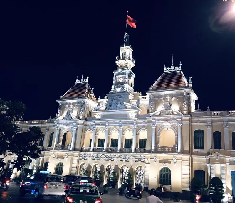 ▲市政厅具有法国建筑风格,线条简洁但是不简单。红色的屋顶、黄色的外墙,虽然在夜幕之中仍然可以感受到简洁干练的美。夜晚附近灯光闪烁,周围还有卖折纸、小玩意以及水果摊的摊贩,环境的热闹和政府大楼的庄严形成鲜明对比。