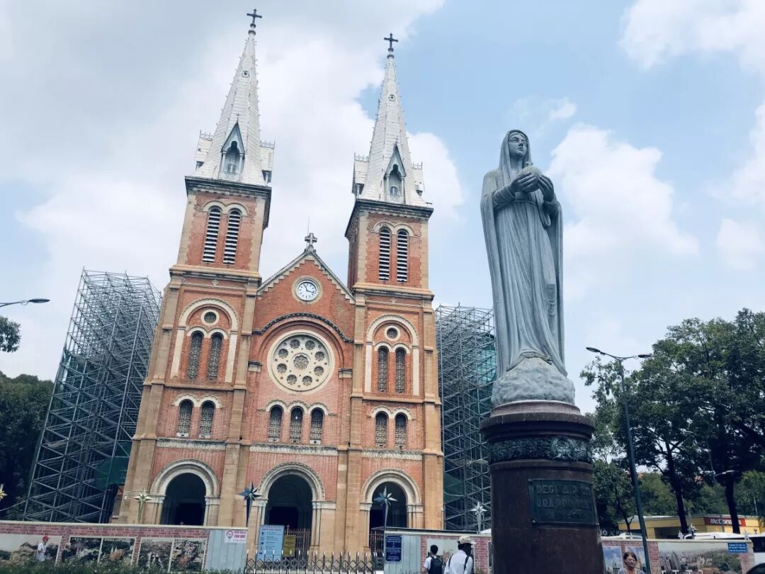 ▲红教堂是西贡最著名的地标建筑,位于最热闹繁华的地方。该建筑仿照巴黎圣母院钟楼设计,造型匀称、庄严雄伟。虽然拥有百余年历史,然而色泽依然鲜明、毫无褪色。站在教堂外面的门廊位置,一边触摸精美的雕饰,一边感受教堂给予人的心静还有神圣之感。