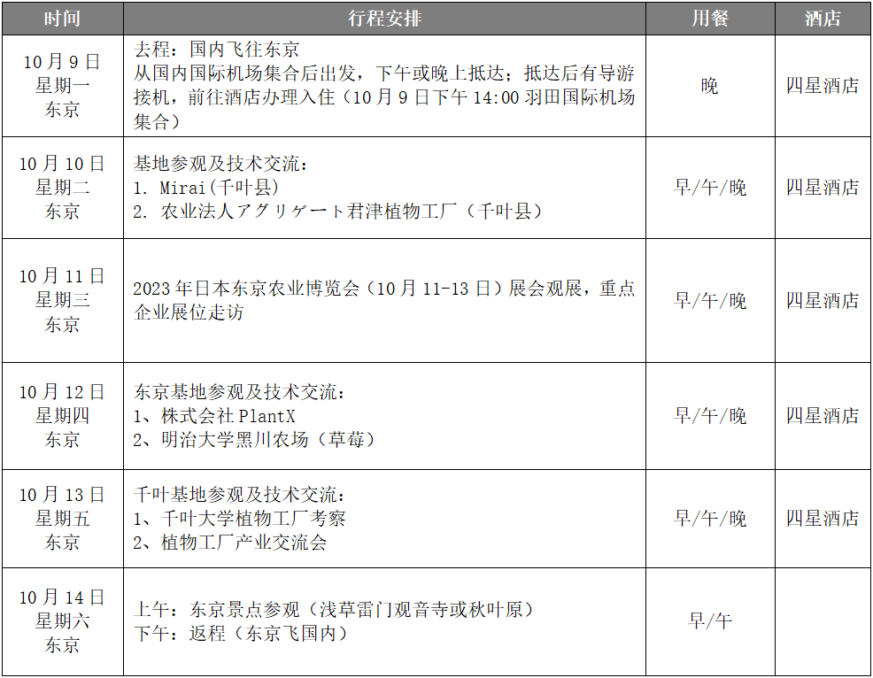 本次游学计划于2023年10月9日-10月14日、日本东京农业博览会期间开展,以参观日本东京农业博览会为契机,就植物工厂产业进行广泛而深入的交流,以掌握最新的植物工厂应用技术,同时从生产加工到销售全方位了解日本农业产业链各个环节的最新技术,从而为中国农业的可持续发展探索出具有创新性且切实可行的解决方案。