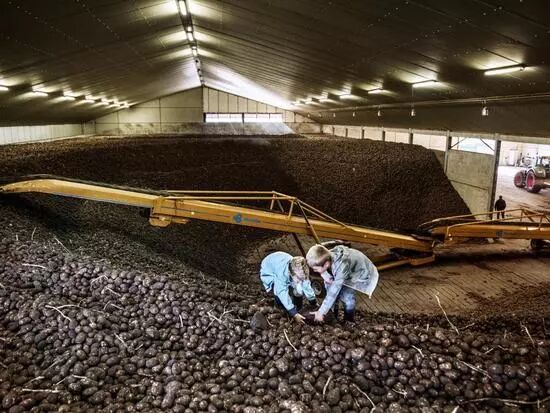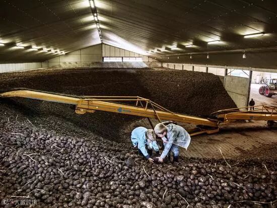 图8:在这个大棚里,两个金发碧眼的孩子坐在土豆山上。伯恩家的2个女孩在自家的土豆山上玩耍,这里的土豆产量是全球平均水平的两倍。至于原因吗?无人机和其他工具被用于评估单个植物的健康状况,并确定它们具体需要多少水和营养才能茁壮成长。