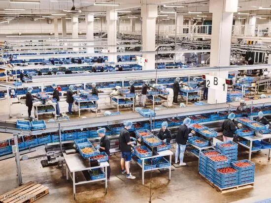 图13:许多人在工厂里包装产品。荷兰是仅次于美国的全球第二大食品出口国,这在一定程度上要归功于像Greenpack这样的现代加工公司,它们连续不断地将新鲜的水果和蔬菜运送到世界各地的市场。大部分产品都是在其他国家生产的,大量运往荷兰鹿特丹港,包装后通过空运、铁路和海运进入市场。