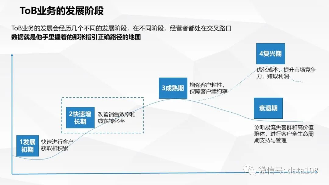 ToB业务的发展会经历几个不同的发展阶段,在不同阶段,经营者都处在交叉路口,数据就是他手里握着的那张指引正确路径的地图: