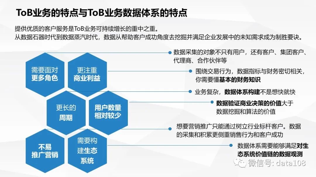 1.数据指标更多的是围绕企业间的交易行为,即你付钱我给你提供出和服务,围绕“钱”,很多的指标与财务指标密切相关。