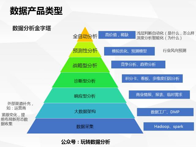 最高端的数据产品,是能做到全自动分析,就是你输入你一个要解决的问题,这个产品能自动产生有效的解决方案,直接供你去采取行动甚至帮助你实现行动。这类型的数据产品行业上几乎没有,但是部分实现还是有的,例如广点通的广告自动推荐,已经可以自动做好用户兴趣判断、广告样式选取、推送等,但是还不能直接代替人的决策行为,如果能加上一键购买&退换货无忧,让用户感知不到电商的存在,就更加全自动了。