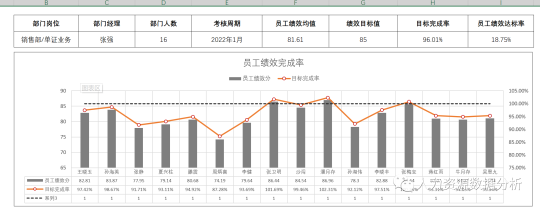 绩效分析的目的是做绩效改进,提升业务的绩效考核数据,所以绩效分析我们以月度为单位,来分析每个员工的月度绩效数,在月度绩效分析中,我们选择的关键指标是每个员工的月度的绩效达成率这个指标,我们对每个月每个员工的绩效数据进行分析计算,算出每个员工的绩效达成率,然后找到绩效达成率最低的那个员工,在分析这个员工月度的KPI各维度的数据,最终找到他的绩效考核中,最低的哪个维度,进行绩效辅导和绩效改进。