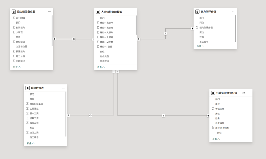 要构建这样一个数据仪表盘,其背后涉及多张数据表,比如人才盘点数据汇总表、员工人员信息表、薪酬数据表、绩效表等。这就涉及到多表关联的内容,也就是通过相同字段将多张表进行关联,从而实现数据的交互。