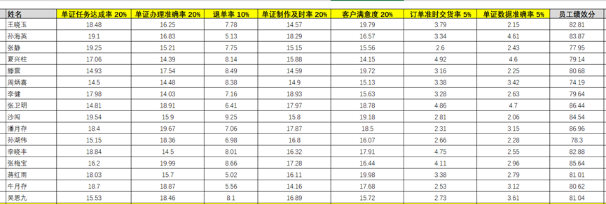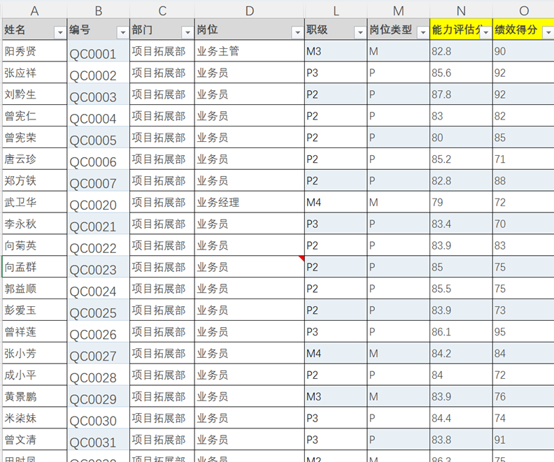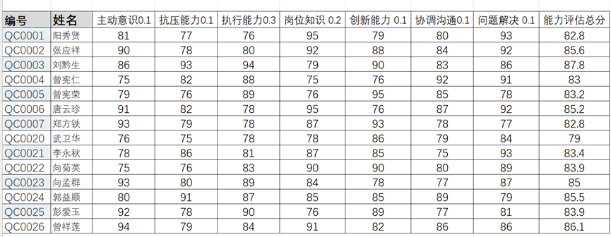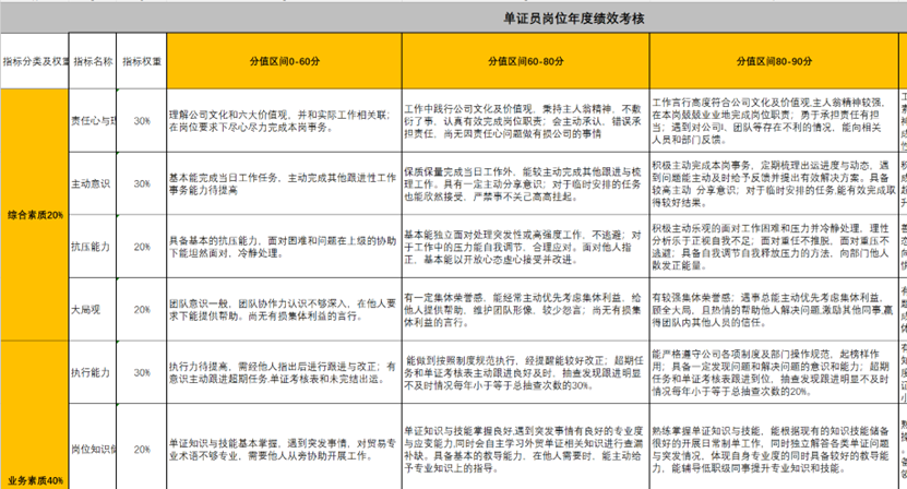 2. 能力维度:每年年底会有基于岗位胜任力模型的能力评估表。表中包含各个岗位的能力维度、能力评分规则等内容,汇总后可得到每个员工年度的能力分值。