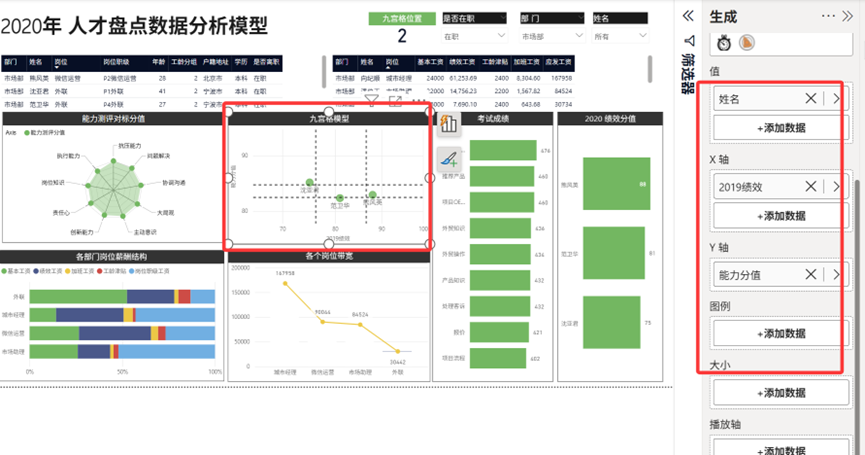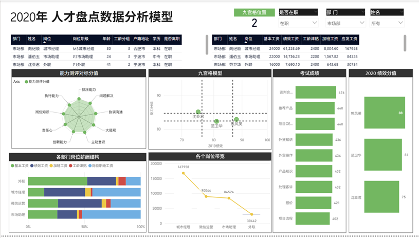 上面展示的是最终完成的人才盘点板块的数据仪表盘。该数据仪表盘由多个模块组成,包含人才盘点九宫格模型、员工能力雷达图、员工信息数据表以及员工绩效数据等,形成了一个数字化的图表模型。
