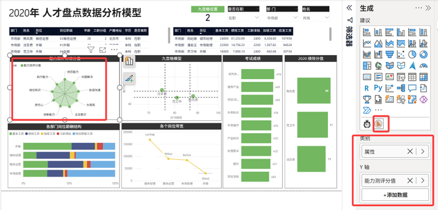 员工能力雷达图这一数据模型的目的,是分析并判断每个岗位员工各项能力数据的分值,从而清晰呈现出哪些能力分值高、哪些能力分值低。在 Power BI 中,本身并没有默认的雷达图,我们使用的雷达图是通过加载第三方数据模型实现的。加载完成后,将相关字段提供给第三方数据模型,就能生成雷达图。