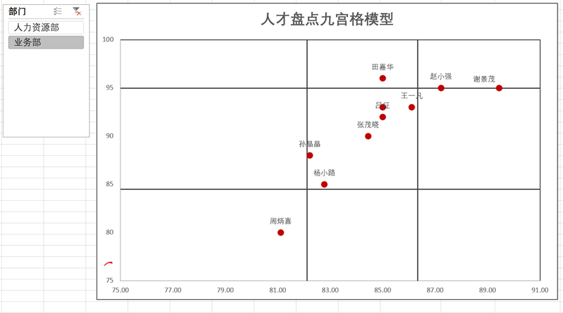 其次,Power BI 有助于实现人员的精准识别。在 Power BI 构建的人才盘点指控体系中,每个员工以散点形式分布在九宫格矩阵里,每个员工都对应一个坐标点。假设我们通过绩效和能力进行盘点,那么矩阵中的 X 轴可代表绩效,Y 轴代表能力。凭借这些精准量化的数据,我们能够精确识别员工在九宫格中的位置,判断其属于双高型员工、双低型员工,还是中间型员工,真正实现用数据识别员工。
