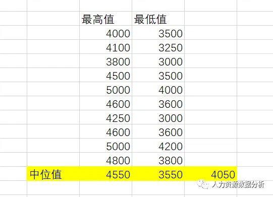 在我们用AI 搜集了各个招聘网站的薪酬数据后,我们需要对岗位的薪酬数据做处理,我们需要取最低值的中位值,然后取最高值的中位值,再对最高值,最低值取一个平均值,这样我们就有了市场的一个薪酬宽带。