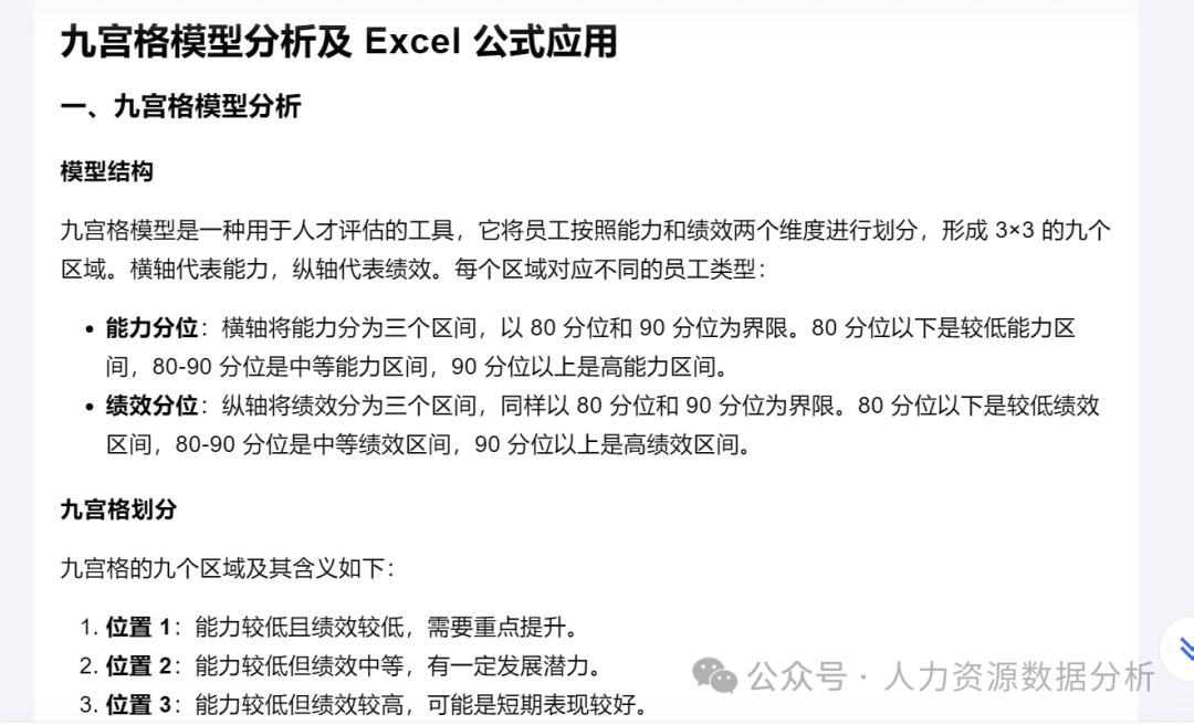 向AI下达清晰指令,要求其分析九宫格模型,理解绩效、能力维度的分位值规则,并依据数据表生成定位员工的函数公式。此过程需注重逻辑梳理,明确各条件间的关联。