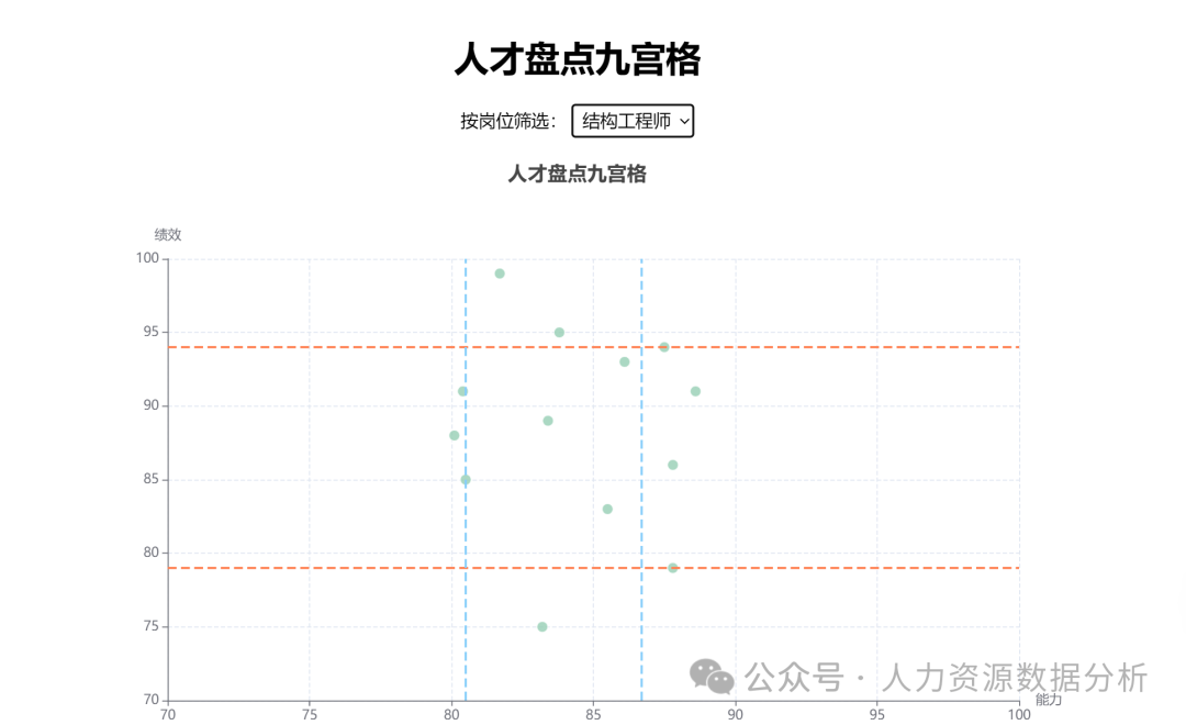散点图呈现:以散点图的形式展示每个员工的绩效和能力,每个散点对应一位员工。