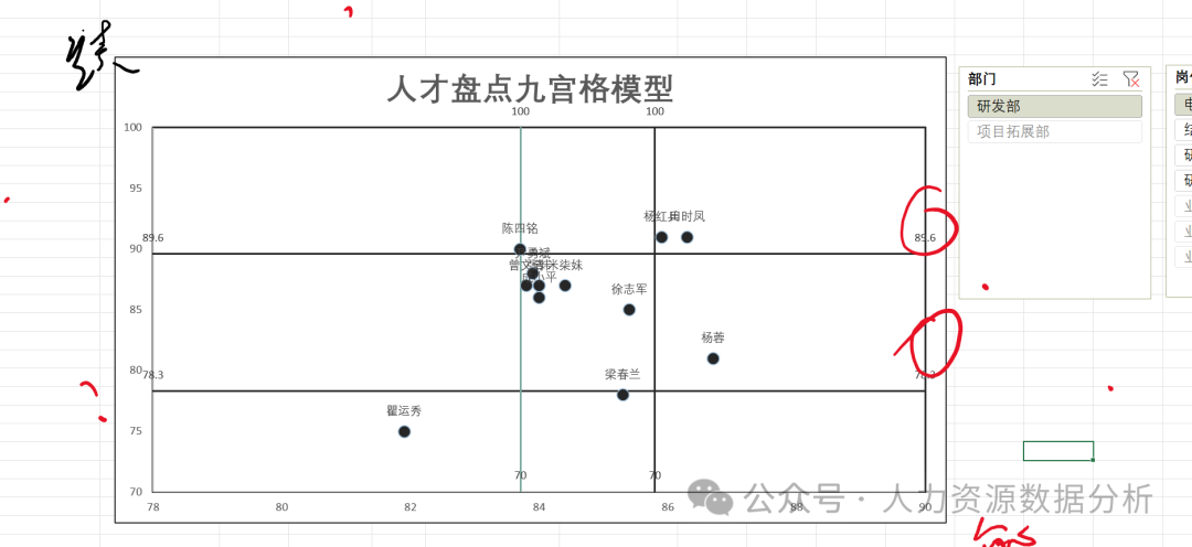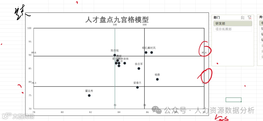 在Excel中,我们基于岗位的量化绩效数据和能力数据来构建九宫格。每个点代表一个员工,通过绩效和能力的等级线划分,形成九个宫格。这样,我们就能清晰地看到不同岗位人员的数据分布,为人才决策提供依据。