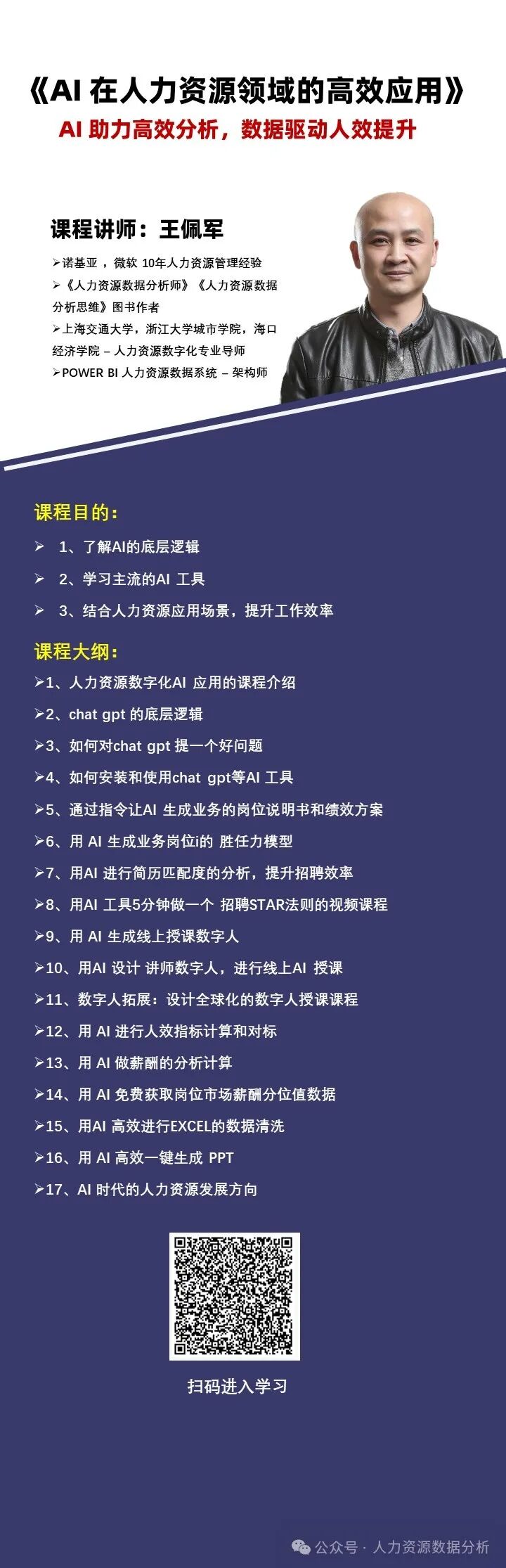 我们结合 AI 和人力资源的各个场景,开发了 AI在人力资源高效应用的课程,以实际案例切入,帮助更多的HR 学习使用 AI 技能,欢迎您的扫码学习和加入!