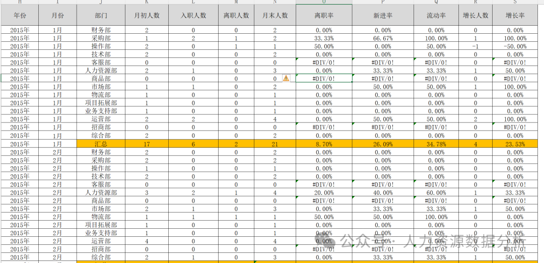 3、人员增长率 = (月末人数 - 月初人数)/月初人数