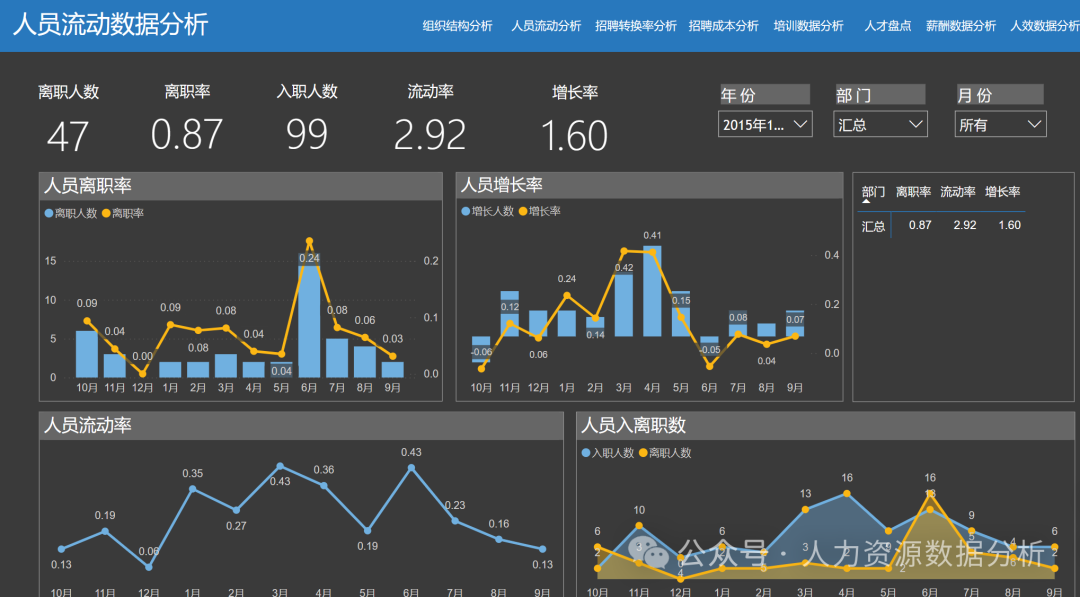 在这个人员流动的数据仪表盘里,每一个关键指标以数据图的形式进行呈现,在交互的维度上,我们选择了 时间和部门的两个我维度进行数据的交叉分析,在这个数据模型里,我们能看到每一年每个部门的各个人员流动数据,也能看到每个部门,在每一个时间段的人员流动数据。