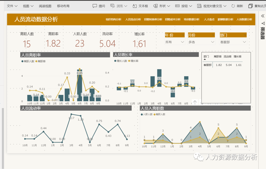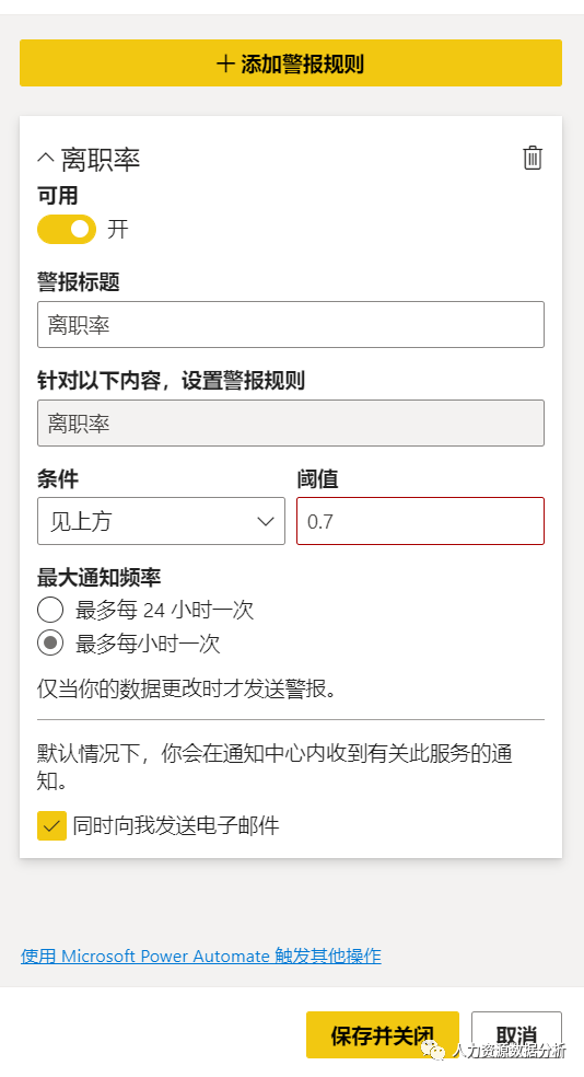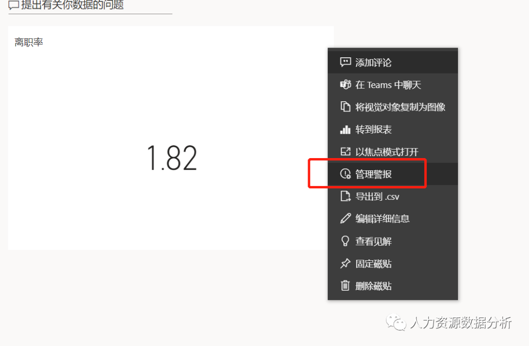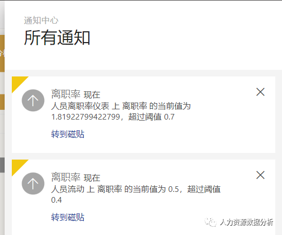 在做人员流动数据建模的时候,会有好几个关键的量化指标,比如人员流动率,人员离职率,人员新进率等相关数据,我们在做数据建模和数据分析的时候,希望可以建立一个人员流动的数据预警,就是说当人员流动率超过一个数据后,会提示我们人员流动数据过高,进行干预,最好还能发邮件提醒,在POWER BI里有一个神奇的工具,就可以做到数据的预警。