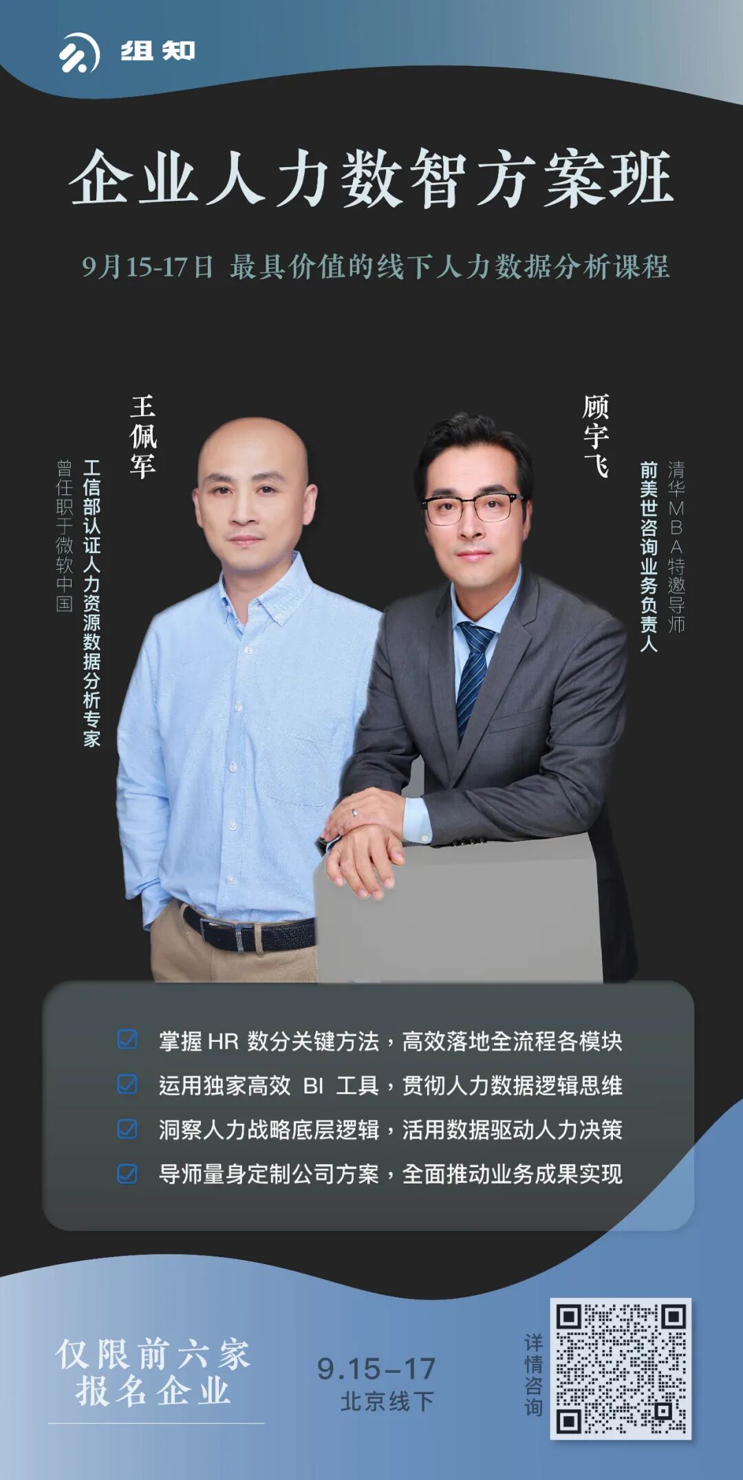 我和顾老师加起来在人力资源行业从业超过35年。这次方案班的设计融合了我给字节、阿里、腾讯等100+企业内训的经验,倾注了大量心血,希望可以帮助你和团队通过使用智能化的高效BI工具,跳出单点的执行工作,真正地建立人力资源数据化全局观,用数据驱动决策,进阶成为不可替代性极高的数智化战略型HR。