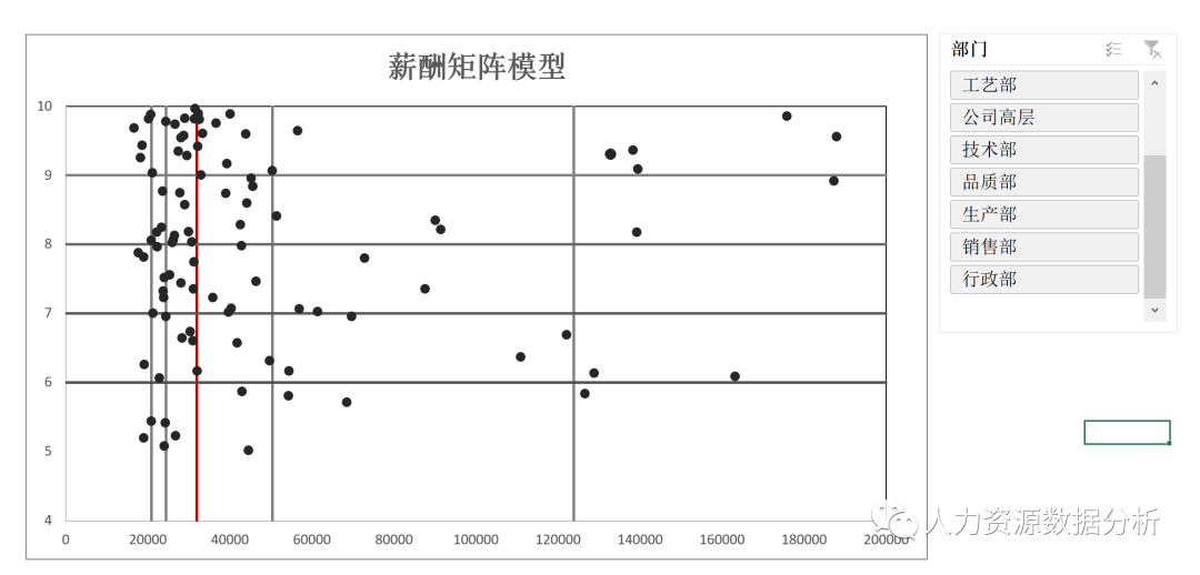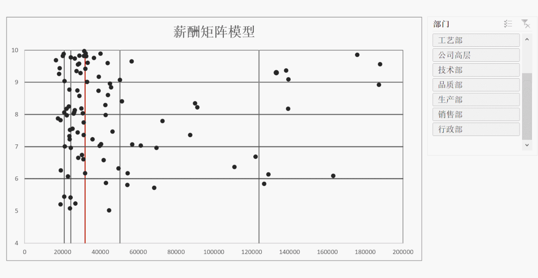 在做这个模型的时候,最关键的就是模型的设计思路,以部门或者岗位为基础进行数据的交互,并且在交互的同时要确保,各个薪酬和绩效的分位值是这个岗位的数据,同时我们也可以对散点图加数据标签,这样就可以看到每个员工在 绩效 - 薪酬矩阵的数据分布。